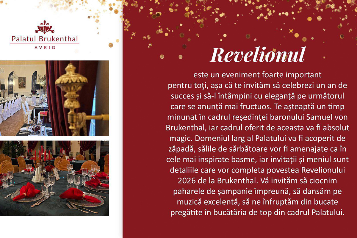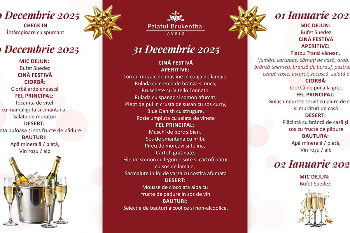 Dieses einzigartige Barockdenkmal, auch „Versailles von Siebenbürgen” oder „Eden von Siebenbürgen” genannt, bietet den Besuchern eine Zeitreise in eine Atmosphäre voller Geschichte, Eleganz und Raffinesse. An Silvester verwandelt sich der Brukenthal-Palast in einen märchenhaften Ort, an dem Tradition, Kulturerbe und der Charme historischer europäischer Cafés den Ton für ein unvergessliches kulturelles und festliches Erlebnis angeben.